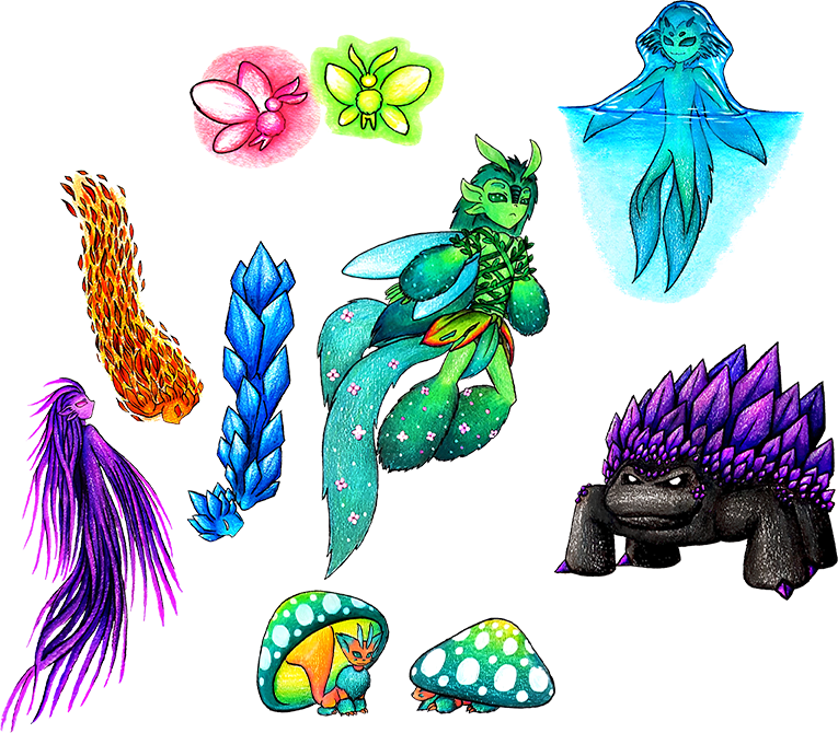Spirit-like being built from flora - like flowers, leaves or tree-roots - or crystals. Like regular faeries, they are not always part of a larger kingdom, but instead can be found floating around lush environments in isolated groups. Wind, solar energy and the power emanating from Celestials fuel their flight; they will often follow around nature beasts and Pandectres who enter their domain.