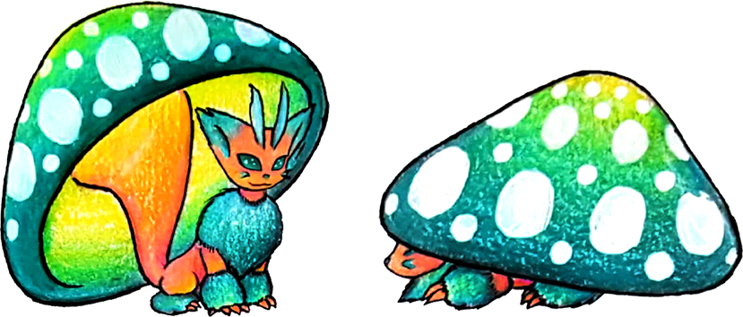 hide under the large mushroom-hats on their tails to surprise passers-by. Large ones will scoop creatures up with their tails and bounce them off for fun.